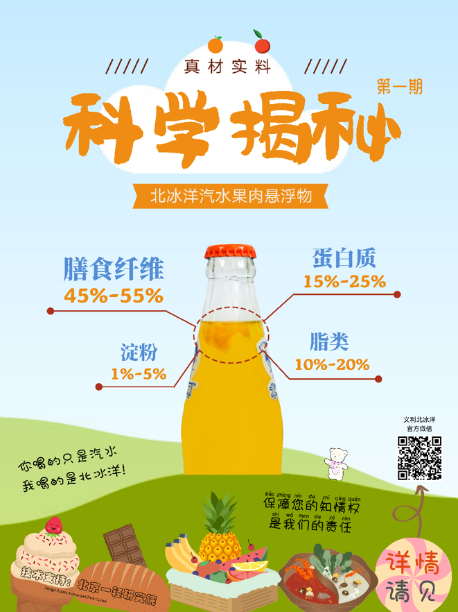 因此,為緩解消費者心理困擾,同時也是保障消費者知情權,我所聯合一輕食品集團義利連鎖公司在全北京一百多家百年義利連鎖店張貼“科學揭秘-北冰洋汽水果肉懸浮物”宣傳海報,助力北冰洋汽水、百年義利連鎖店塑造具有責任感、科技感的品牌形象,在服務主業的道路上又邁出了有力的一步。